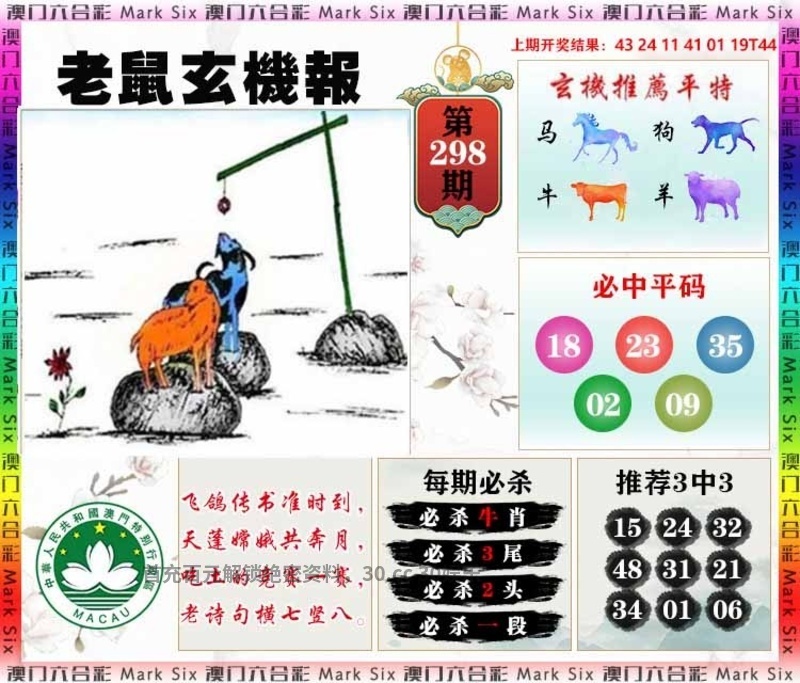 | 298期四肖 | 羊鼠鸡狗 | 开:羊23 |